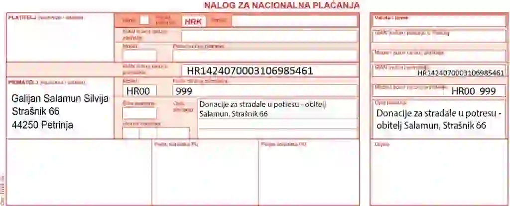 Ukoliko još netko želi pripomoći svojim financijskim prilogom može to učiniti putem donje uplatnice, kako bismo barem jednoj obitelji s područja naše Banovine što prije vratili osmijeh na licu.
